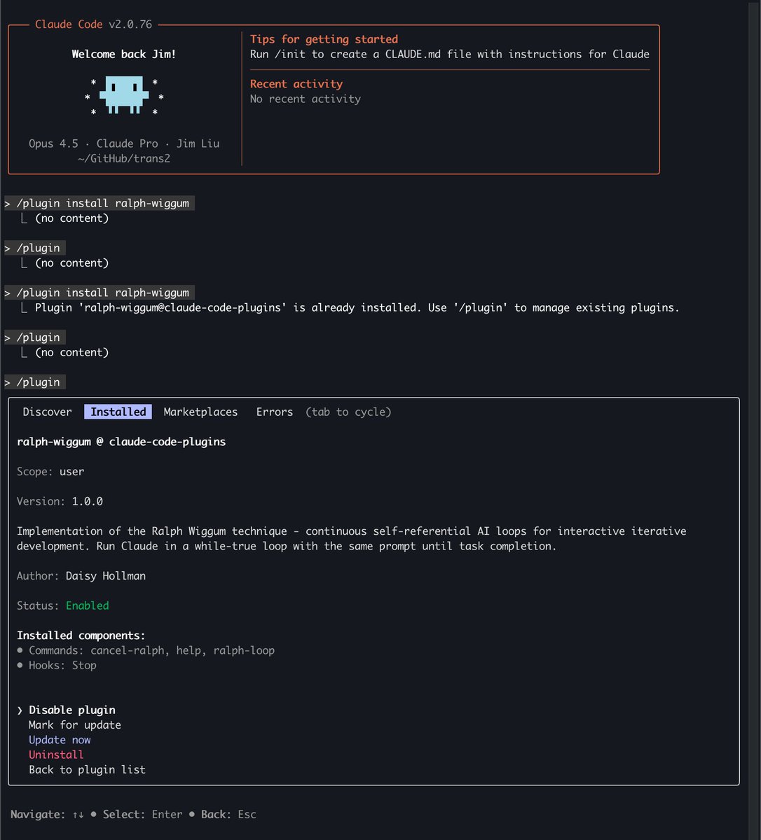- 安裝插件:Ralph Wiggum 插件地址