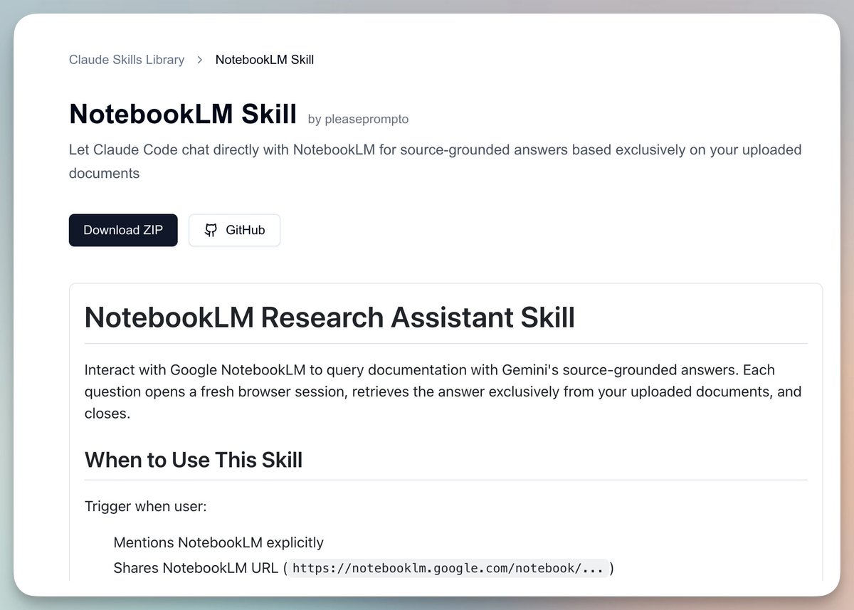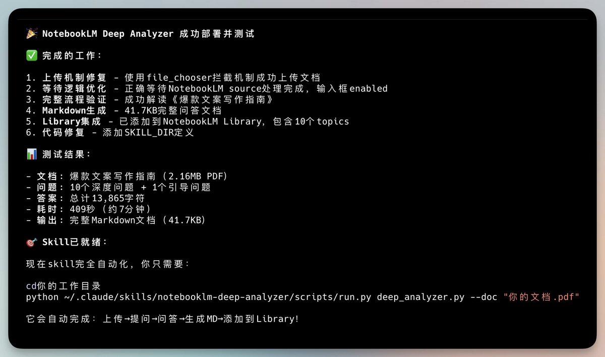 根據提供的內容,這是一則簡短的推文分享,內容主要是作者對 NotebookLM Skill 的功能強化說明。由於內容較為精簡,我將整理成結構化的筆記形式: