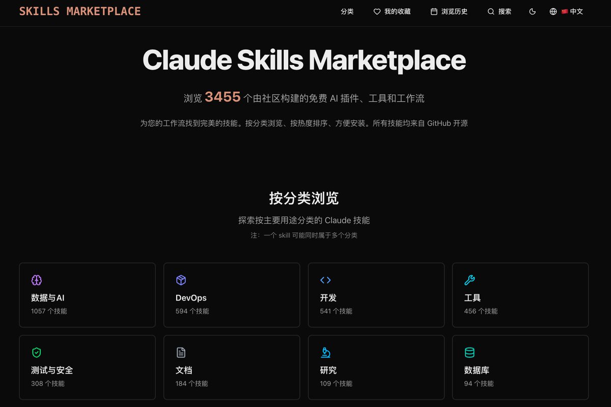 Claude Skills Marketplace 是一個 Claude Skills 開源技能市集,目前收錄了 3455 個 Claude Skills。這些技能涵蓋開發、研究、內容創作等多種用途。