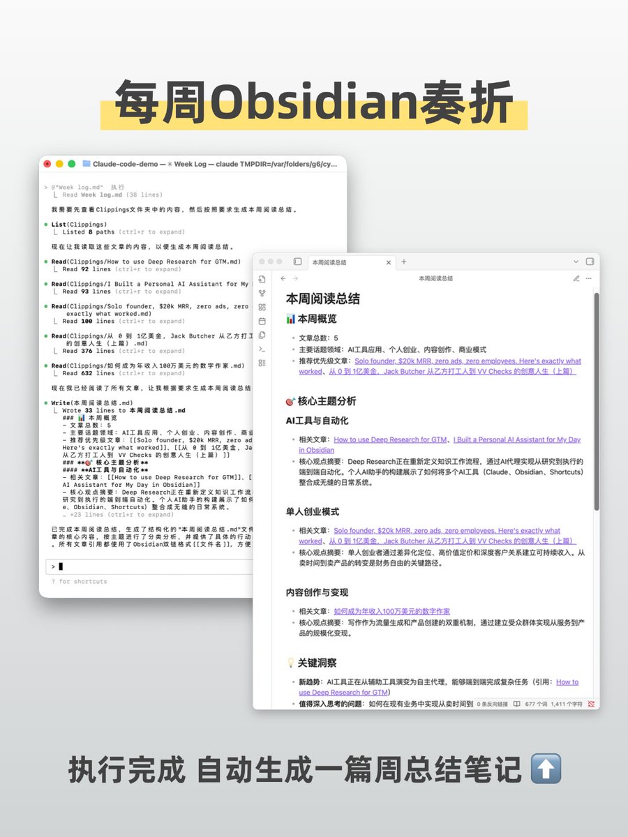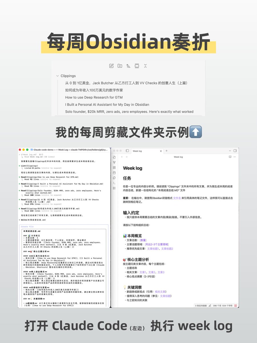 現在完全不一樣了。只需要在 Claude Code 裡說一句「生成本週閱讀總結」,CC 就會把這一週剪藏的所有文章全部讀一遍,然後生成一份結構化的總結報告。