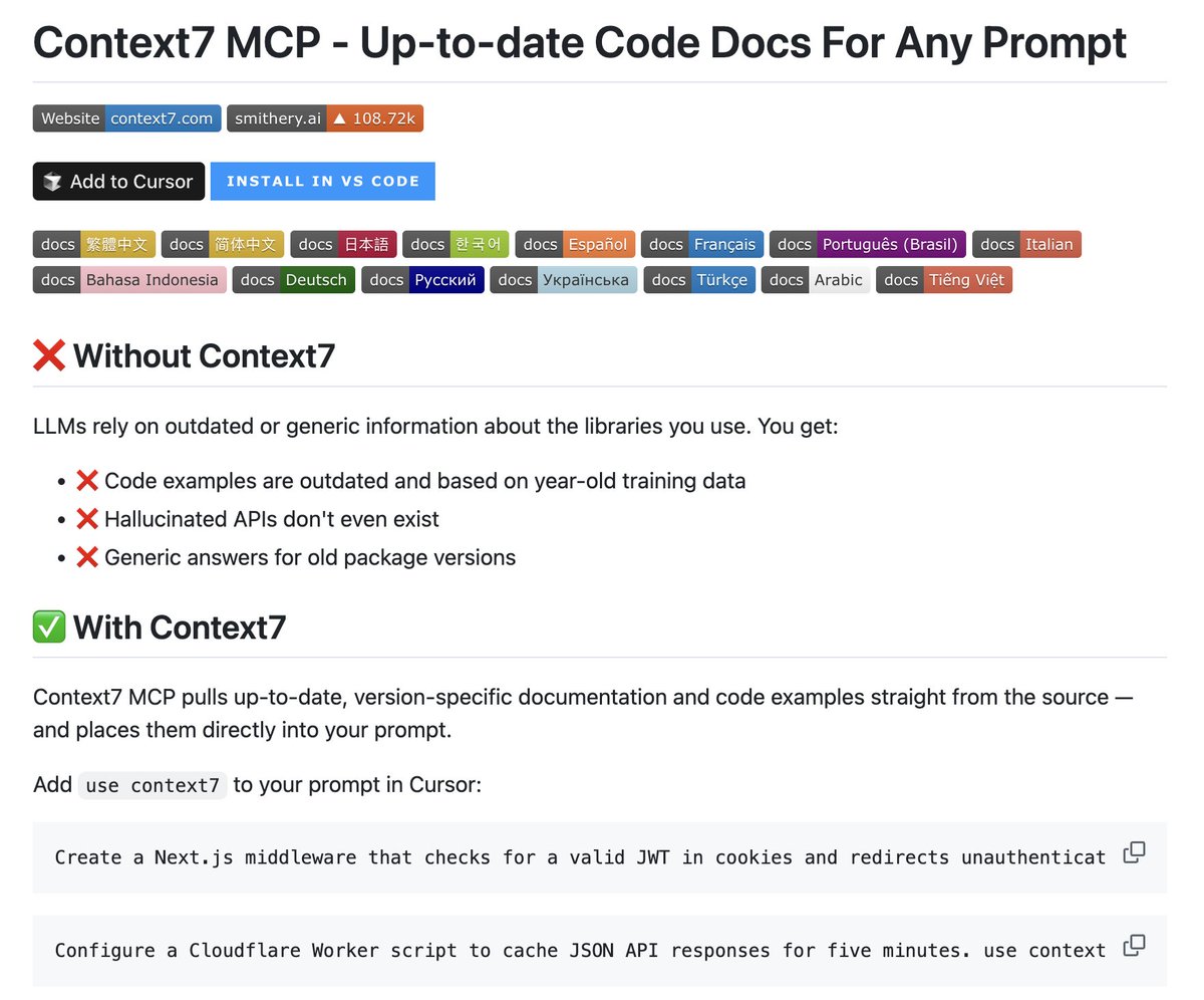 如果你剛開始使用 AI 進行開發,Context7 MCP 是第一個應該安裝的 MCP 工具。它提供了橫跨常用程式庫的最新文件查詢功能,讓 AI 能夠基於最新的文件資訊來協助你開發。