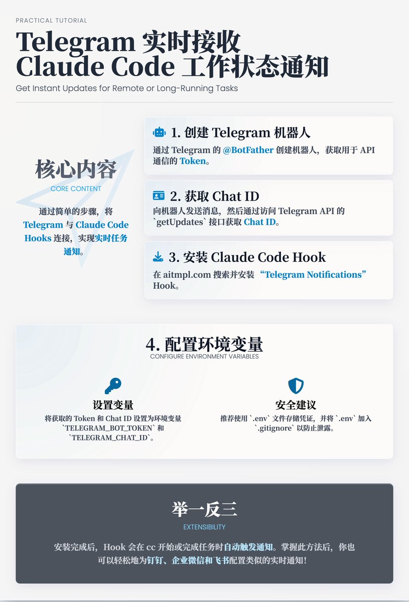 操作:在 aitmpl.com 上搜尋與 Telegram 集成的 Hook,安裝 "Telegram Notifications" Hook。