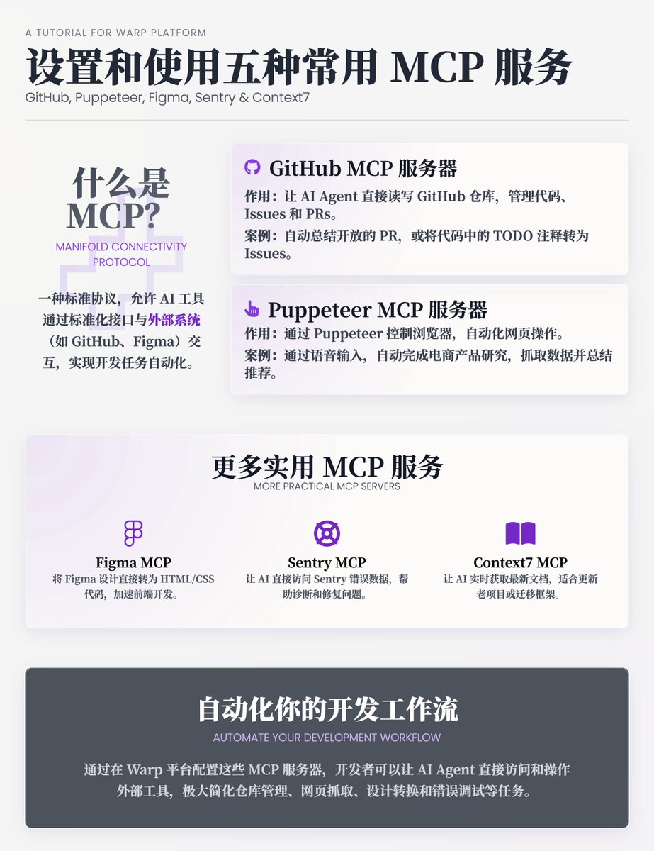 Warp 平台 MCP 服務設定指南:GitHub、Puppeteer、Figma、Sentry 和 Context7