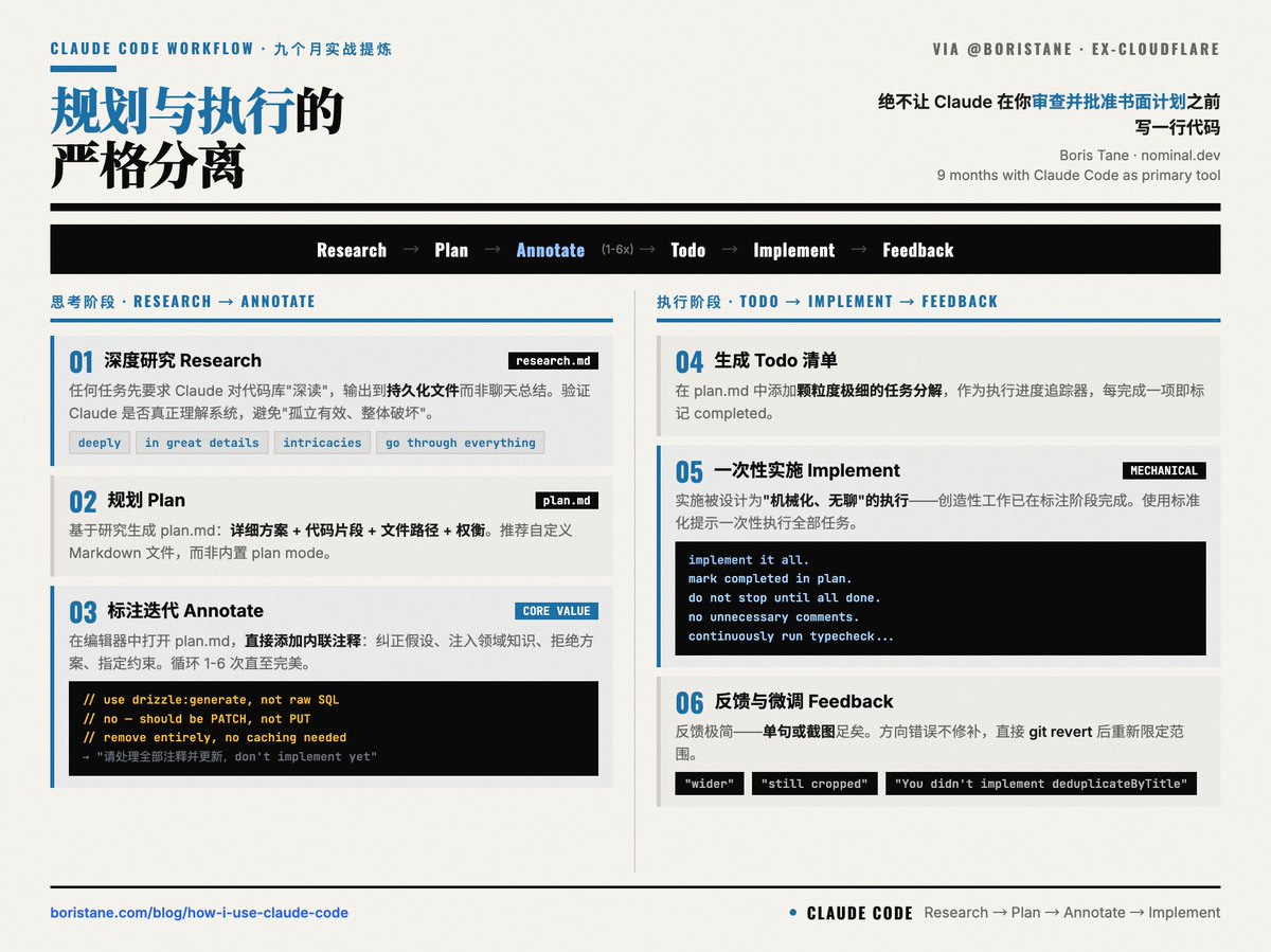 九個月使用 Claude Code 作為主力開發工具後,Boris Tane(前 Cloudflare 工程師,現在做 nominal.dev,要把所有 on-call 的工程師都解放出來)分享了他提煉出來的完整工作流。