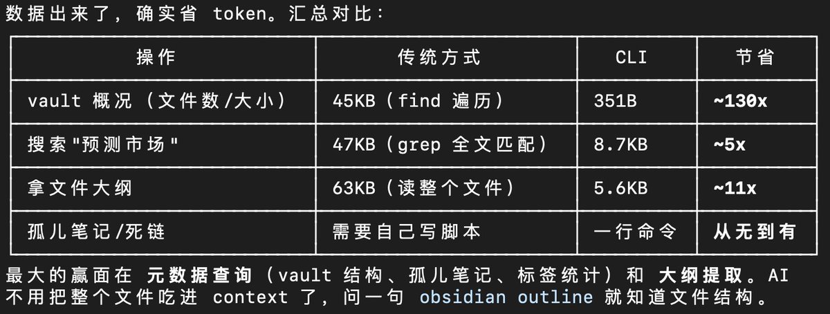 以前 AI 要了解筆記庫概況,得遍歷所有文件(45KB);現在一行命令,351 字節。看一篇筆記結構,以前讀整個文件(63KB),現在只返回標題大綱(5KB)。查孤儿筆記、死鏈,以前得自己寫腳本,現在一行命令秒出。