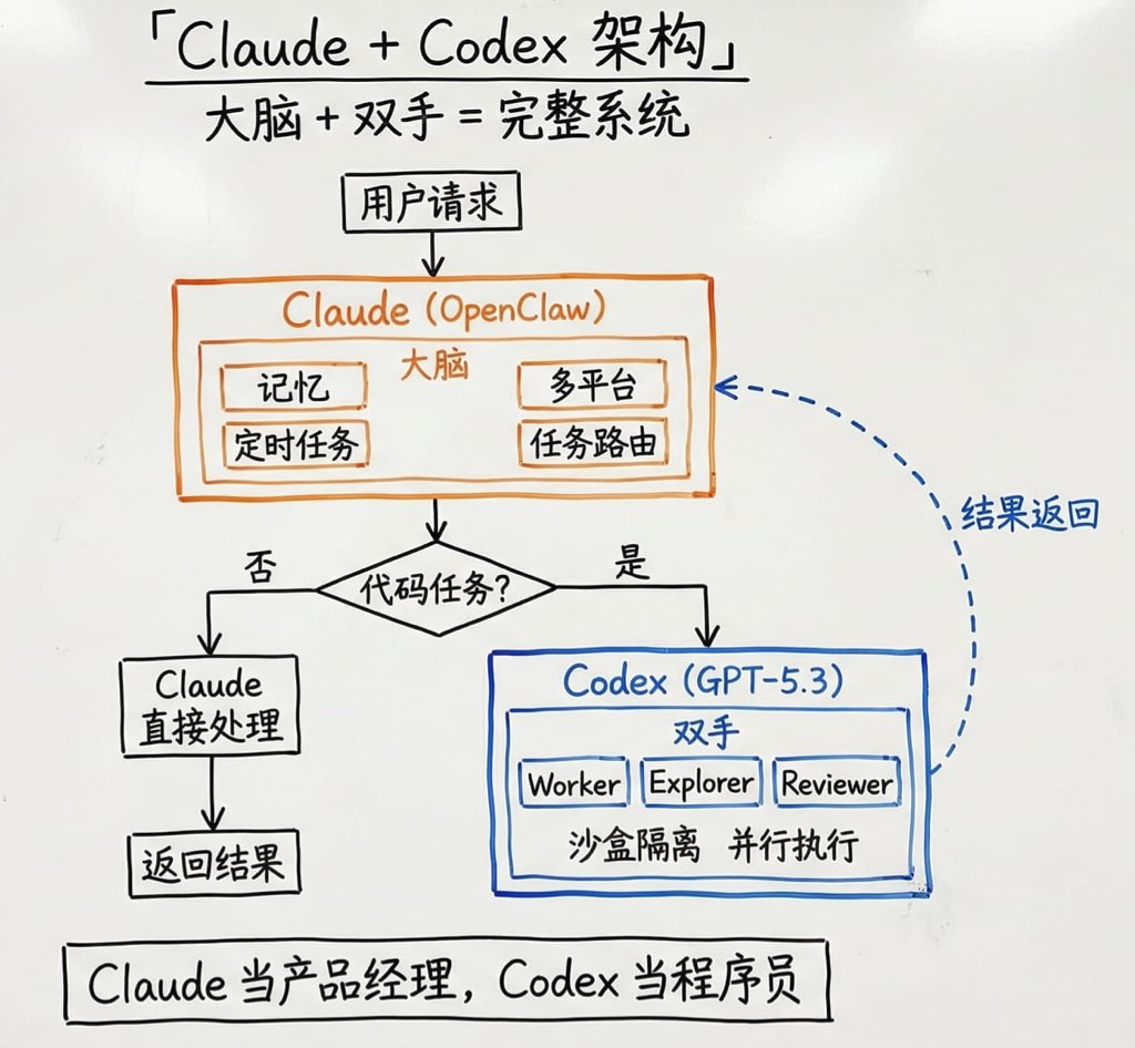 Claude Opus 拆成 3 個任務,給 Codex 的 Worker/Explorer/Reviewer 並行幹,結果返回 Claude 匯總。