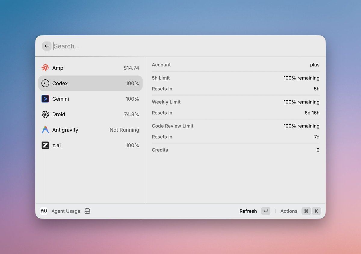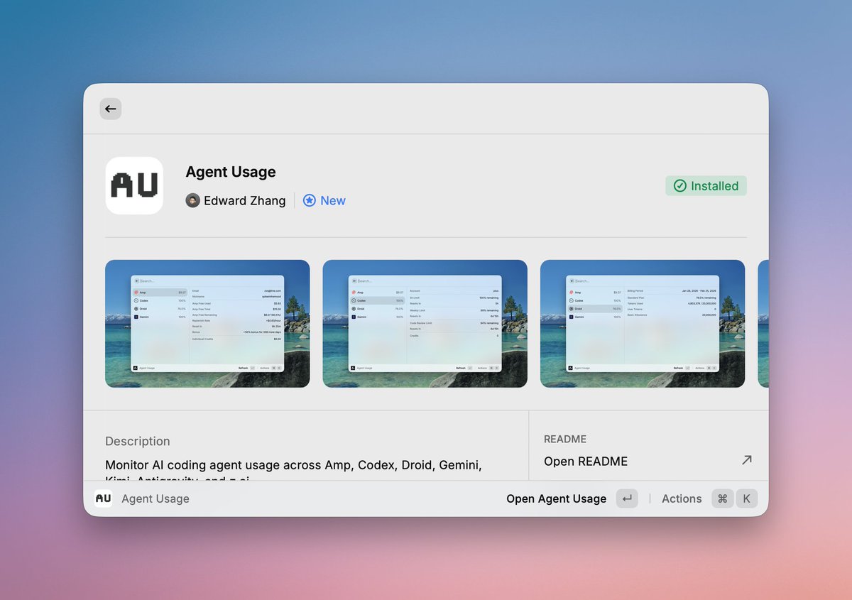 因此開發了一個 Raycast Extension:Agent Usage,已發布可以在 Store 直接安裝。