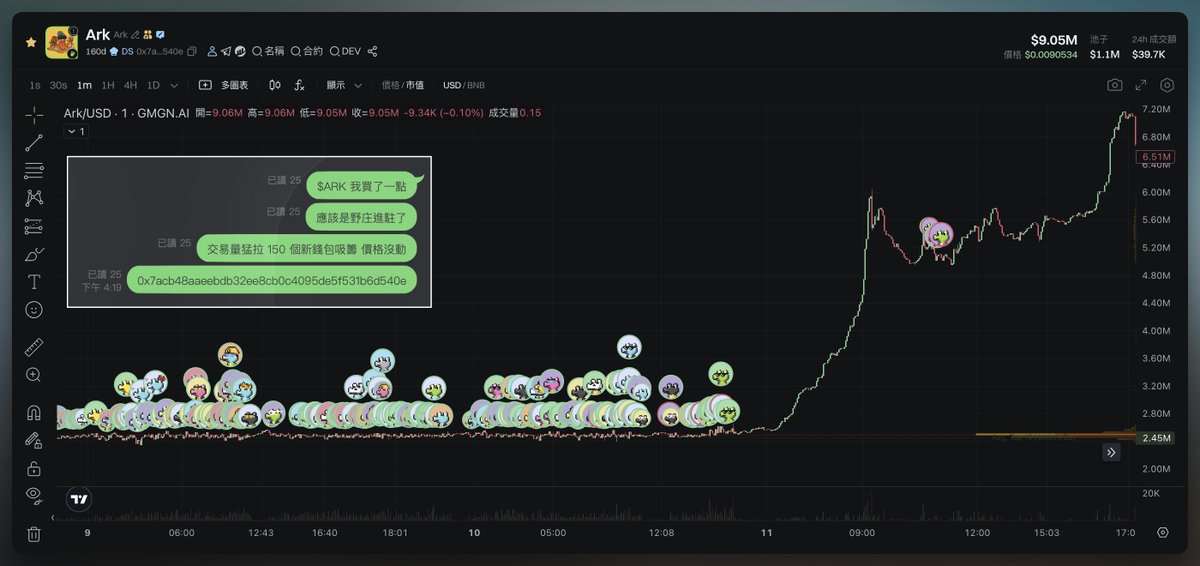 印象比較深刻的是 $ARK,這個就是手法非常粗糙的野庄,全用剛打錢的新地址吸籌了 150 多個號,大號太明顯不敢買,全用小號果斷上車,輕鬆收米了。
