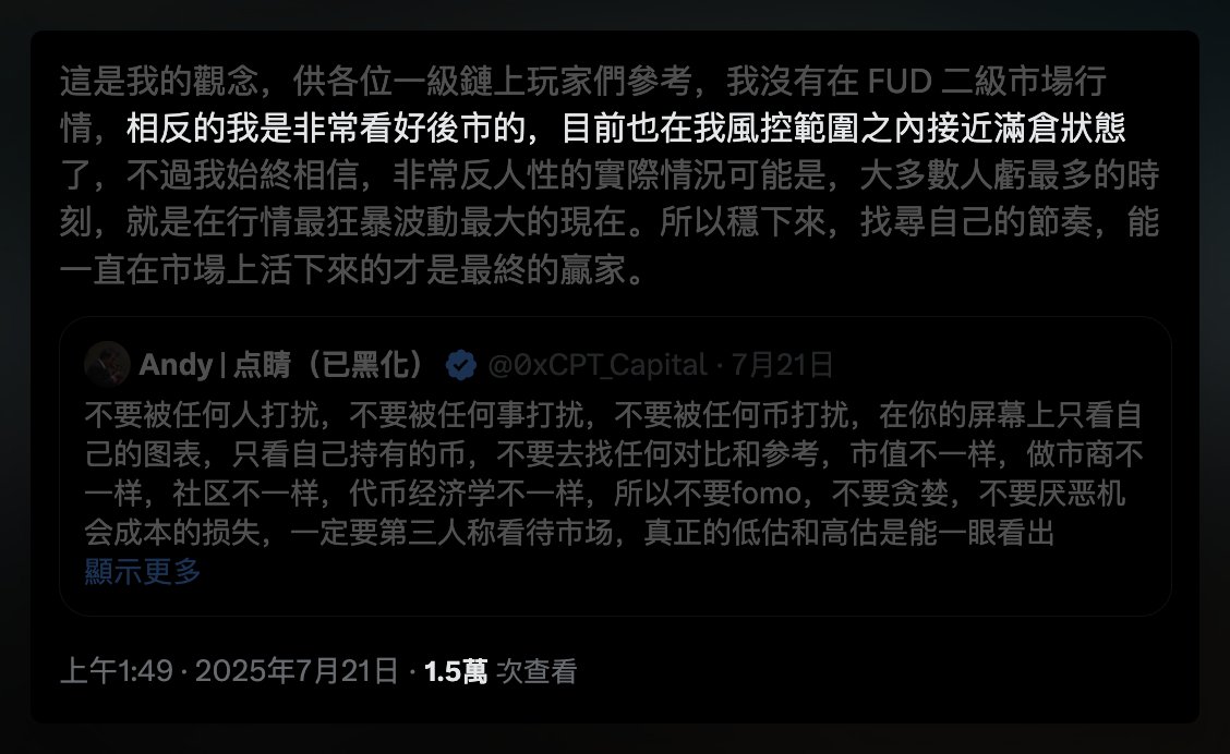 所以賺自己認知內的錢、把握好屬於自己的機會就好,尤其是跟我一樣主攻一級的玩家,我還是建議不要看到二級滾倉之類 m 來 m 去的收益就上頭高槓桿進去瞎玩,永遠做好風控或許比較難暴富,但至少不會損失一發大的,也比較睡的好覺🙏(我是偏保守厭惡回撤的交易者類型)