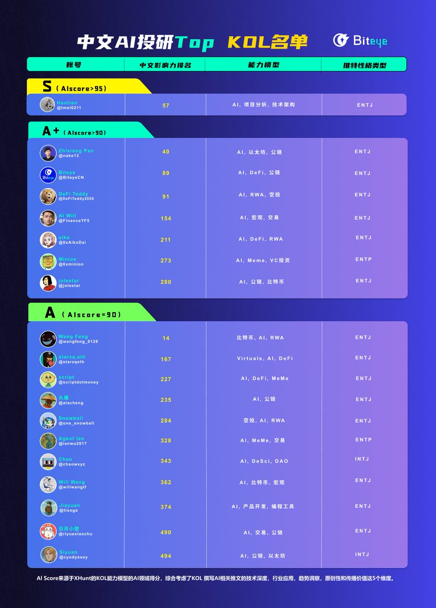 基於 @xhunt_ai KOL 能力模型的 AI 領域得分,綜合考慮了 KOL 撰寫 AI 相關推文的以下五個維度: