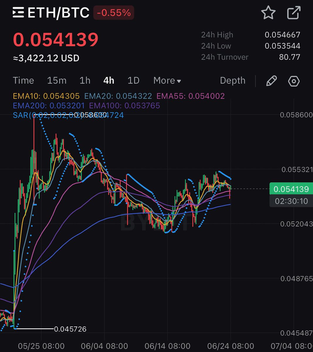 當然 Alt 的情況慘多了。但龍頭 ETH 顯示出了相對的強勢,和 BTC 跌幅差不多,ETH/BTC 維持在 0.054。我認為這顯示 ETH 已經跌到底,接下來如果還有回調,會跟隨 BTC 跌幅或比他跌得少。如果現在入市,入 ETH 在短期內的潛在升幅比較高。