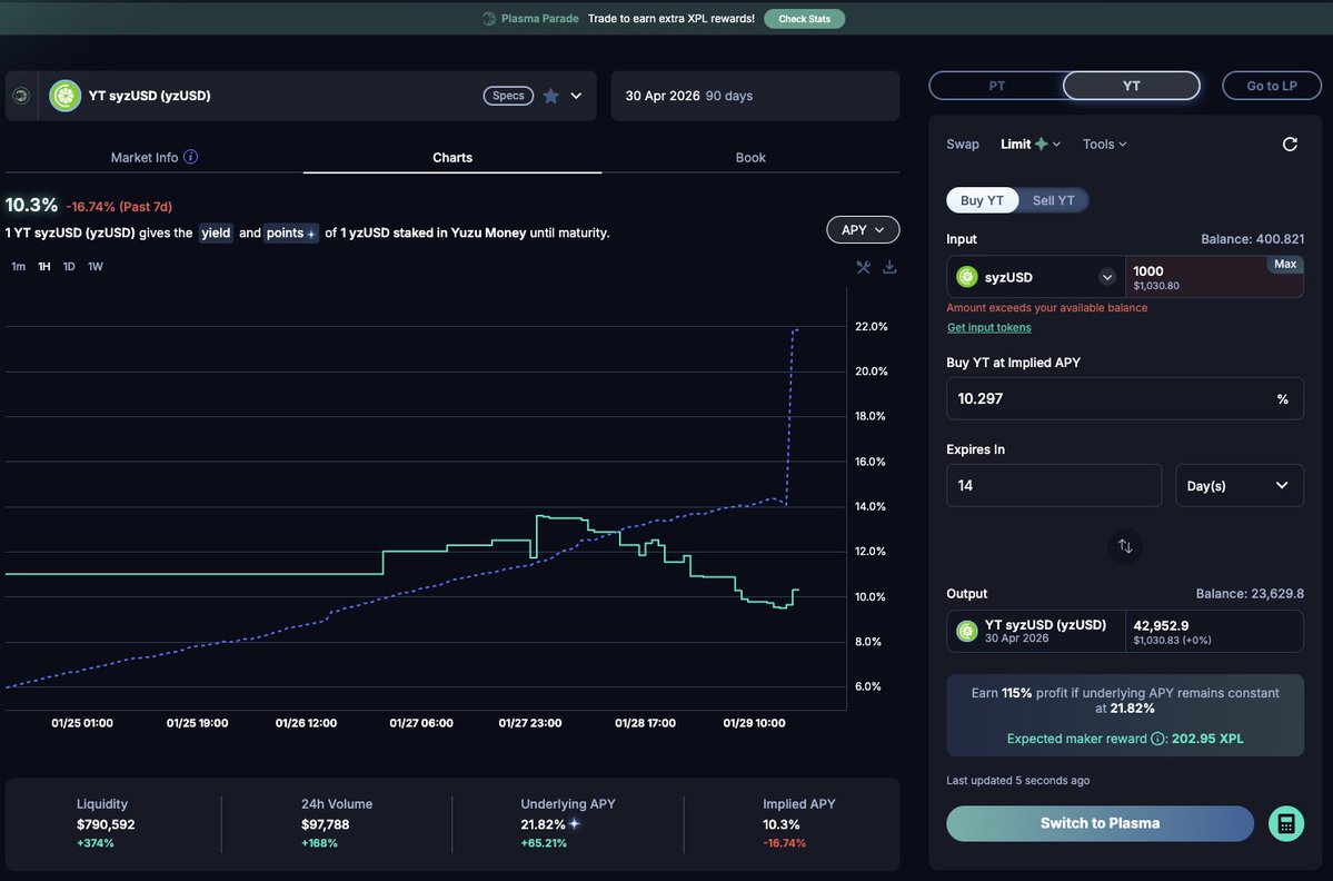 - 建議:可以考慮掛單買入 YT,同時還能獲得 $XPL Plasma 的獎勵。