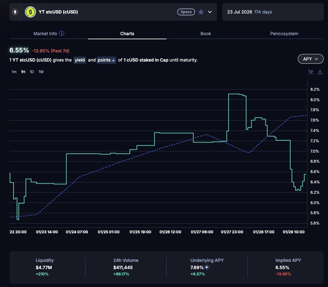 | stcUSD | Capmoney_ 底層收益基本維持在 7% 左右 | 6.5% 的 YT 視為送錢機會。 |