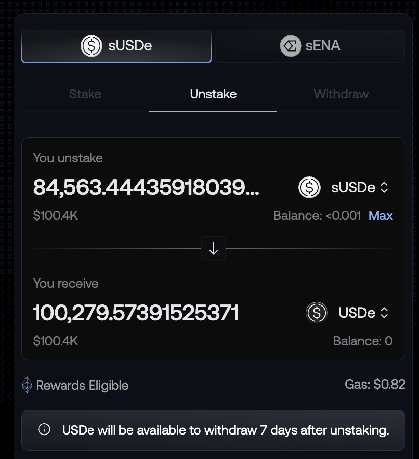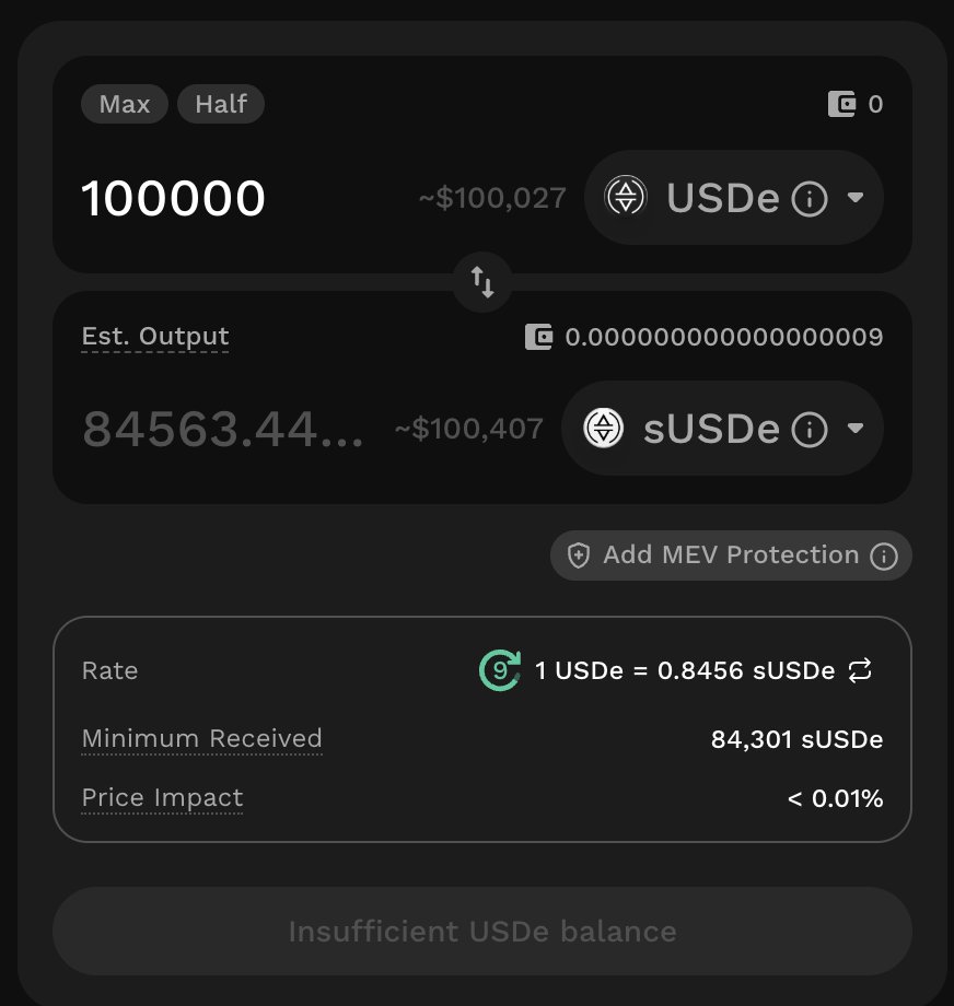 隨著今天 @pendle_fi 大量 PT/YT 到期,也讓本來變相鎖倉的 $sUSDe 釋出,這時候如果想出場又不想等 7 天解鎖期,就只能市場上直接砸。