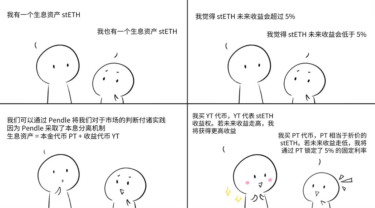 圖裡生動地解釋了,Pendle 是怎麼運行的?如何利用 Pendle 賺錢?邏輯是什麼?