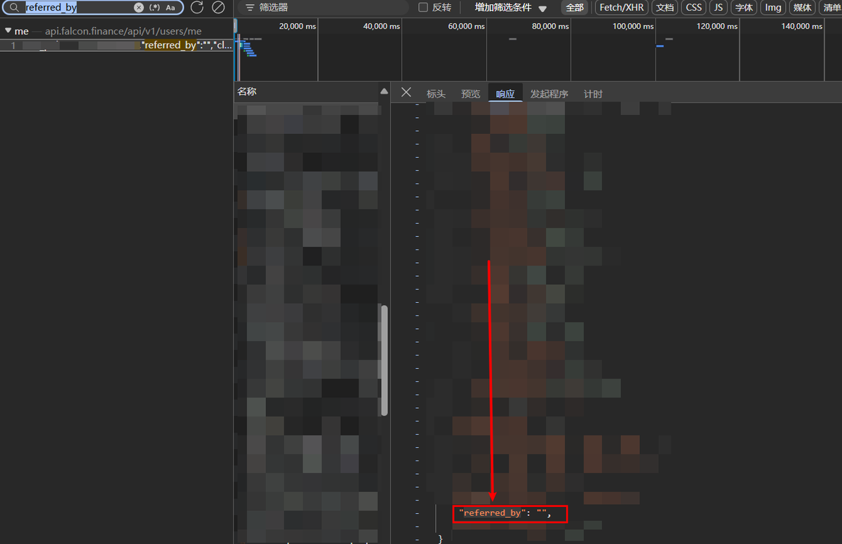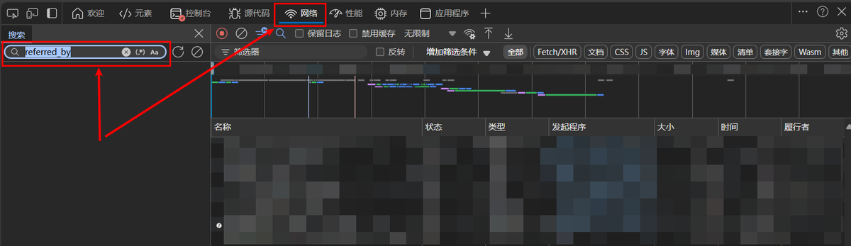按一下鍵盤上的 F12,在出來的瀏覽器工具頁面的上方選到「網絡 (Network)」標籤界面,在左邊的搜索欄輸入 "referred_by",然後 F5 刷新一下頁面