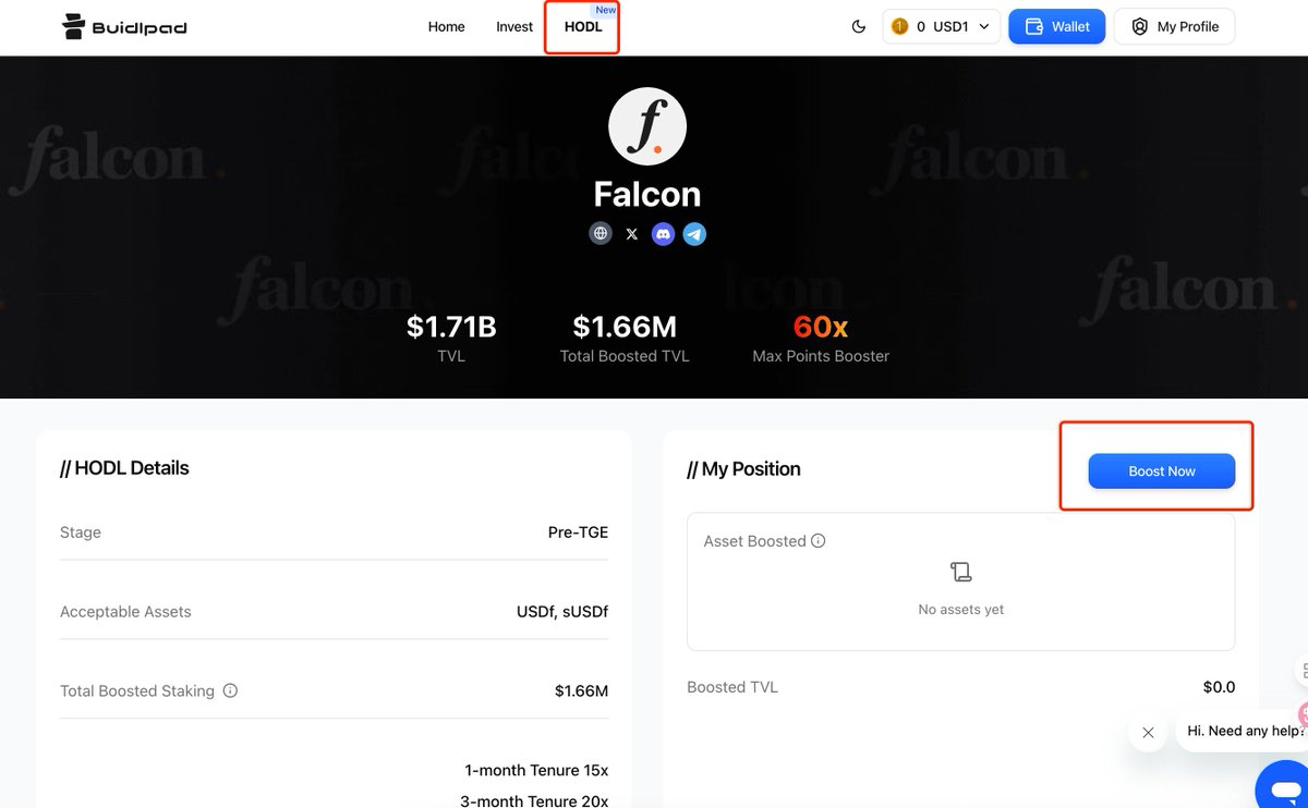 Buidlpad 上線 @falconfinance $FF 打新,需要通過 Buidlpad 官網 HODL 處存入 3000U。