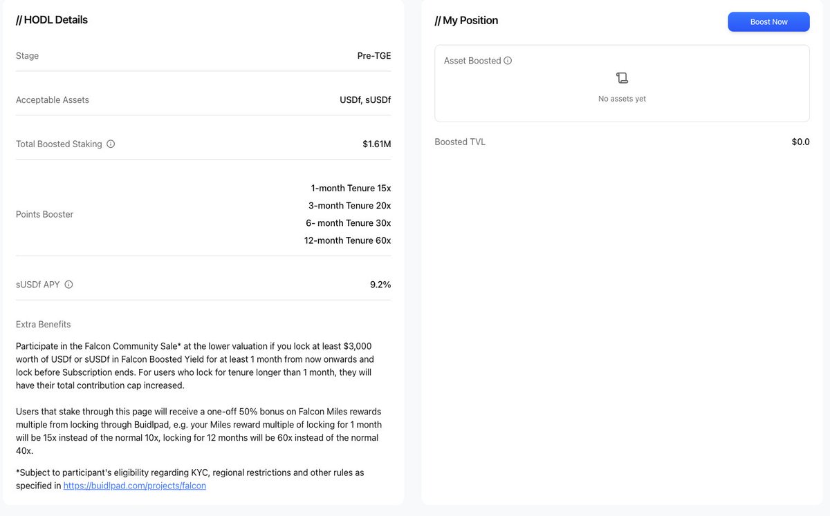 ⭐️ 鎖倉技巧:不要直接在 Falcon 官網 Stake,而是經過 Buidlpad 最新的 HODL 產品去質押,額度提升都是一樣,但這段時間能夠額外獲得 50% Miles 的加成。
