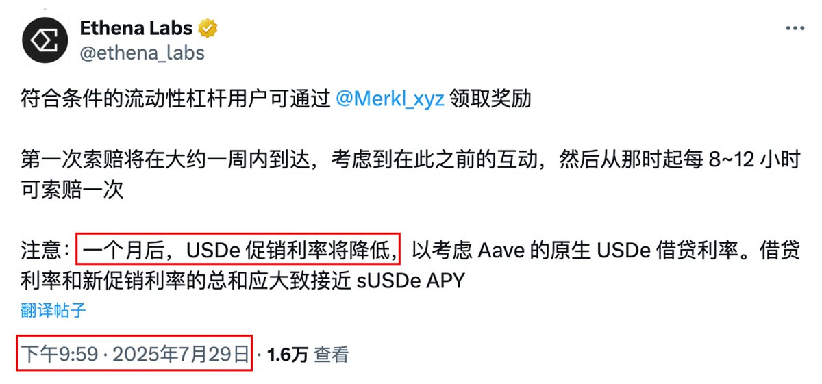 例如,Aave 和 Ethena 的循環貸此前官宣補貼僅維持一個月,之後會降低。如果補貼不再續上,sUSDe 和 USDe 就可能面臨拋壓。