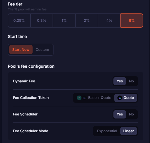 點擊 Fee Scheduler 選項旁的 linear/exponential,可在打開的圖表中看到當前費用 %。