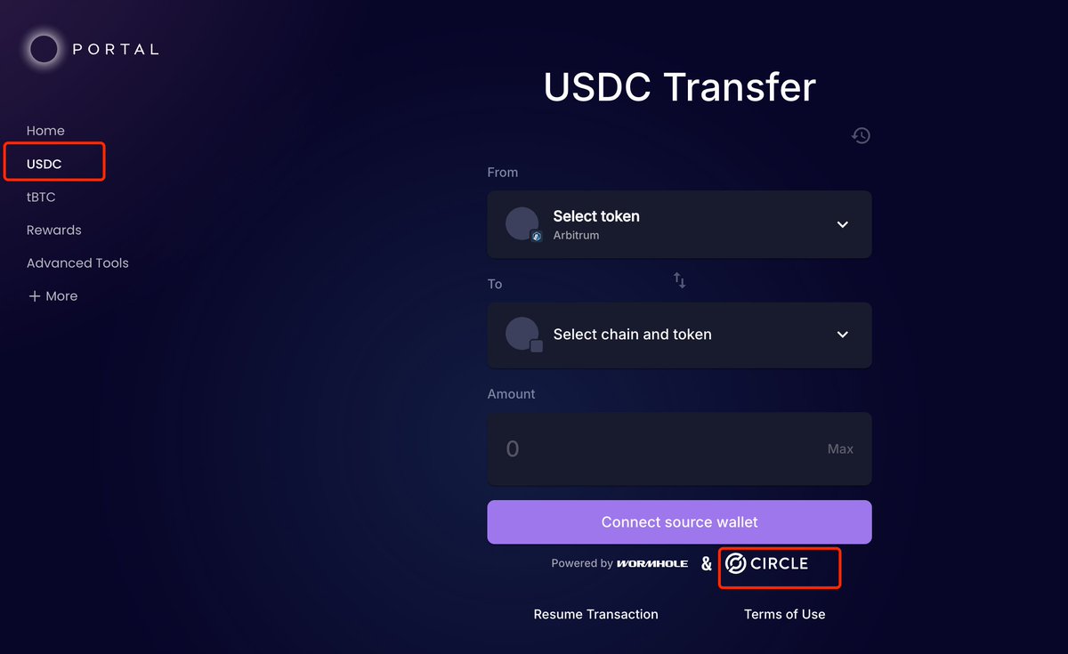 使用 Circle 官方跨鏈橋功能,可在 Portal 側邊欄選擇「USDC」欄位,此功能直接調用 Circle 官方 API。