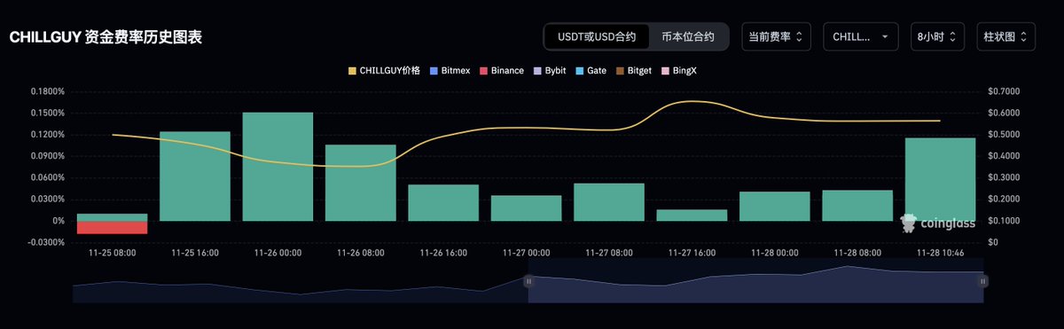 按照今天的數據看,幣安的 CHILLGUY 資金費率為 0.11% × 3 × 365 = 120.45%