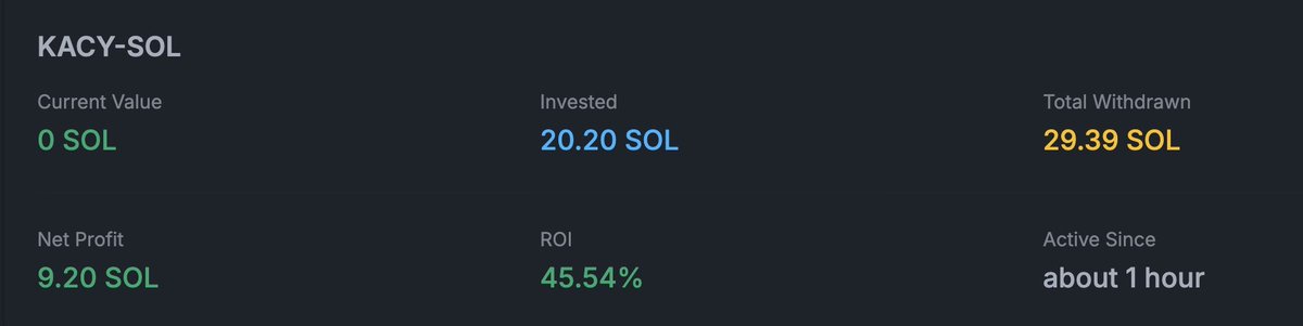 今天早上在約 8M 市值進入這個 $KACY,後面漲到 20M 時強制止盈出局。算上手續費收益,ROI 接近 50%(實際漲幅則有 150%+ 之多)。