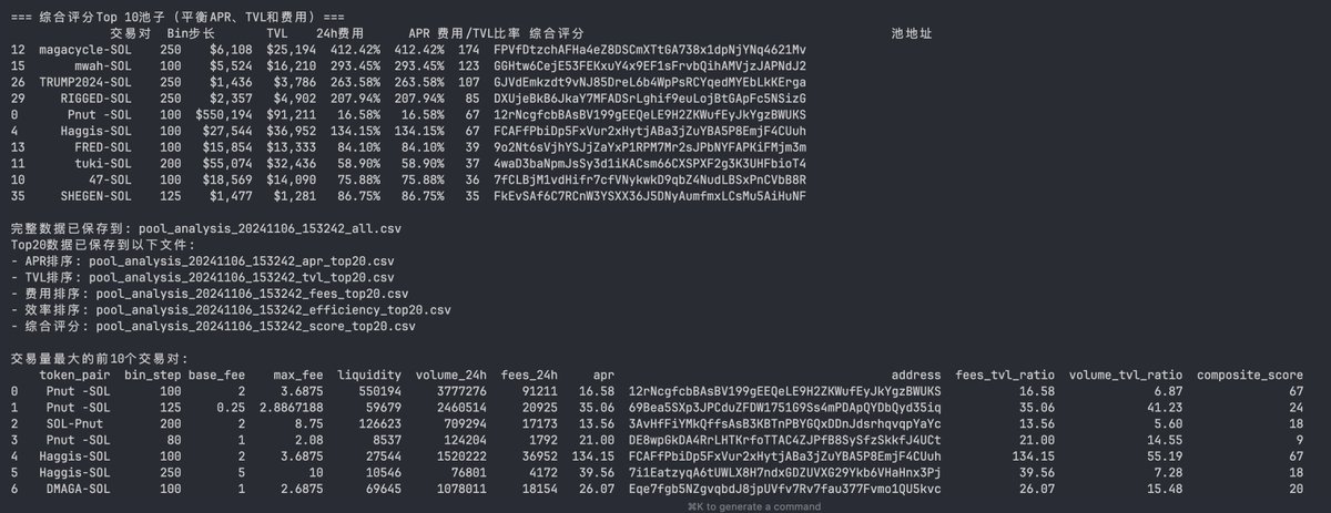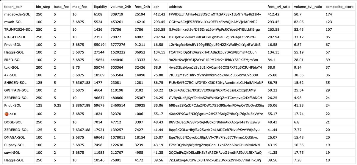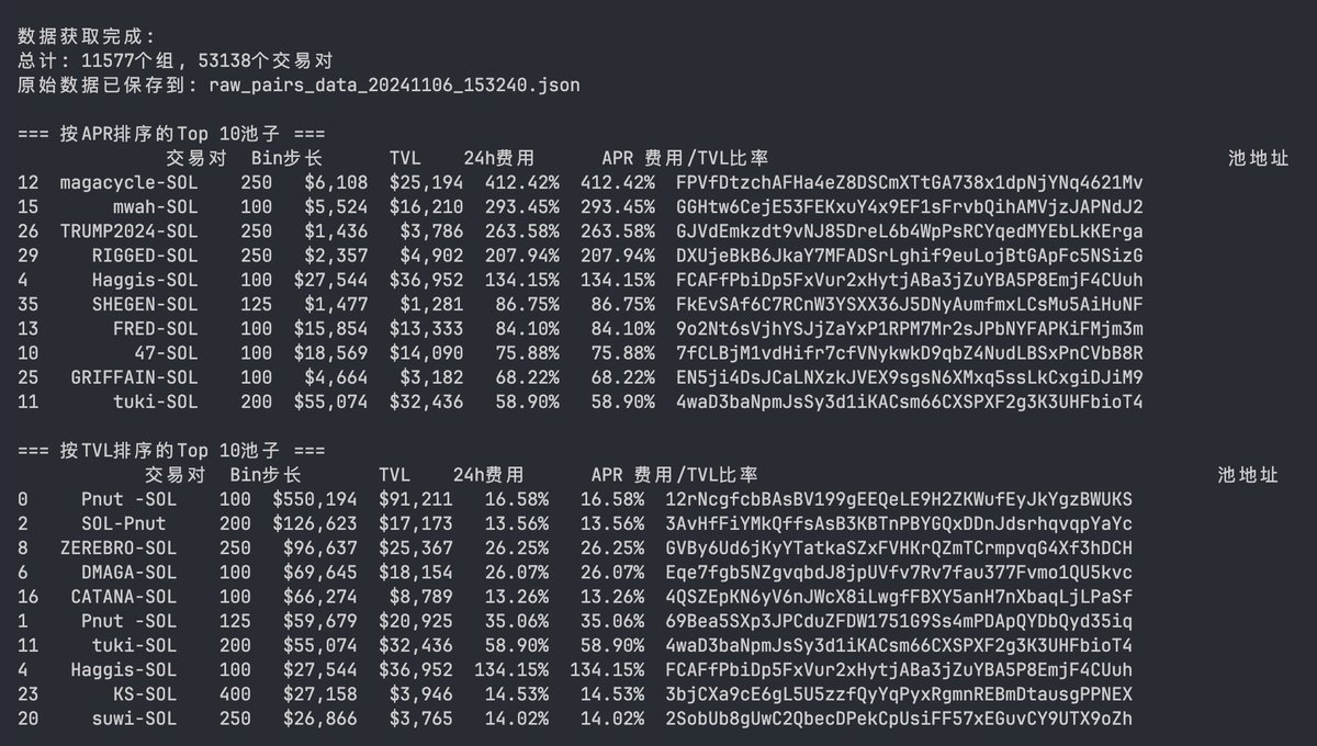 還有個偏穩妥,但不會拉下熱點太多的思路:抓取 DLMM 池子的全量數據,再進行數據處理、分析,根據你的需求,篩選對應的池子,組 LP。