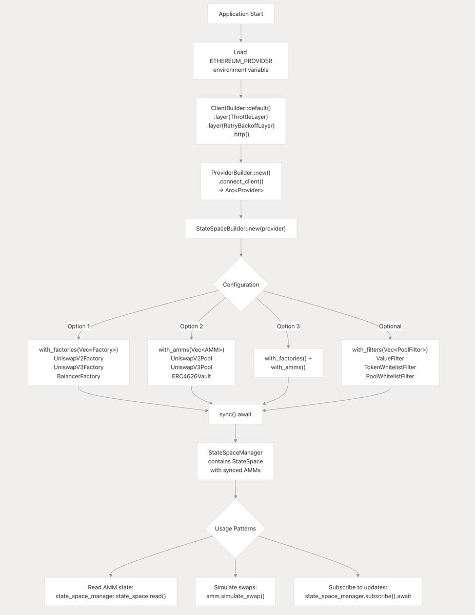 StateSpaceBuilder 是初始化和配置 amms-rs StateSpace 的主入口點,可以設定同步的起始區塊號,以及: