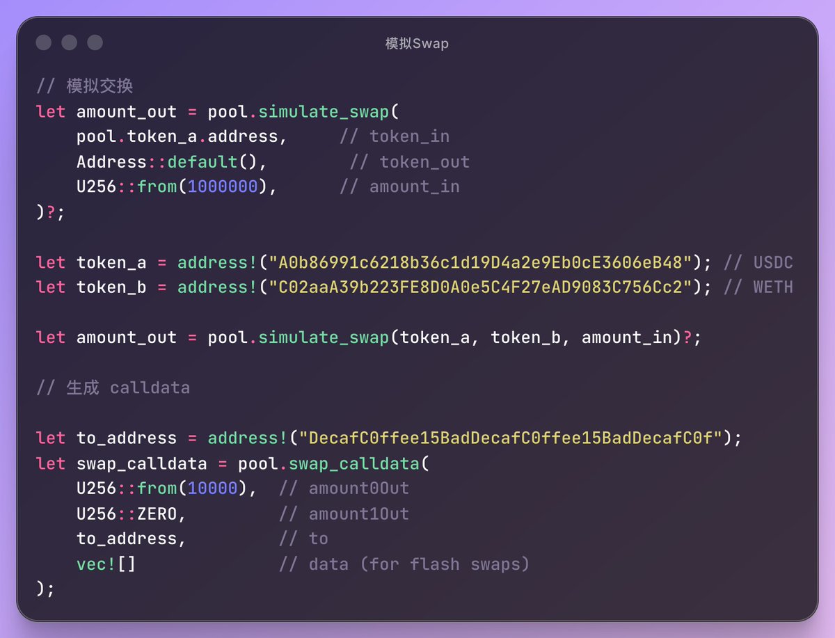 AutomatedMarketMaker::simulate_swap() 方法在本地計算輸出金額而不執行交易,這非常適用於套利檢測、價格報價和 MEV 策略!因為 amms-rs 擁有強大的 AMM 協議實現。