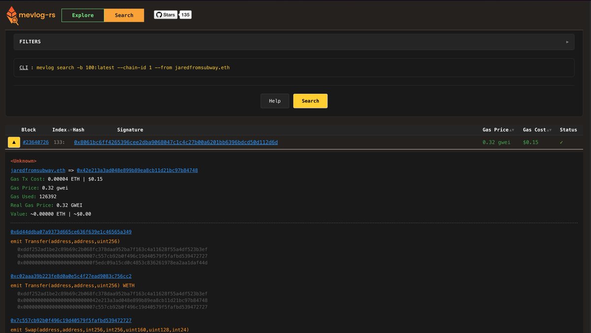 mevlog-rs 是一個能夠像查找資料庫一樣來搜尋查詢 EVM 鏈交易的工具。
