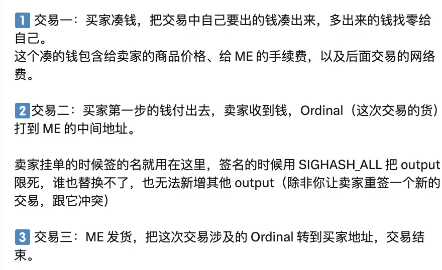 賣家簽名的時候還不知道買家是誰,但需要提前確定收貨地址(因為要用 SIGHASH_ALL,而不是 SIGHASH_SINGLE),所以引入一個 ME 的中間地址來構造簽名。成交時再通過第三步打給買家。