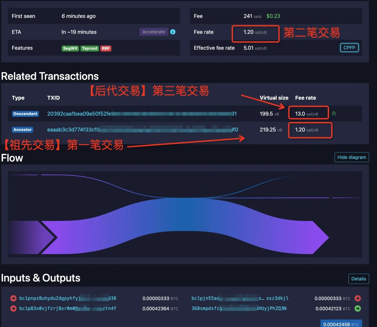 - 交易三:採用更高的費率,通過 CPFP(Child Pays For Parent) 進行加速