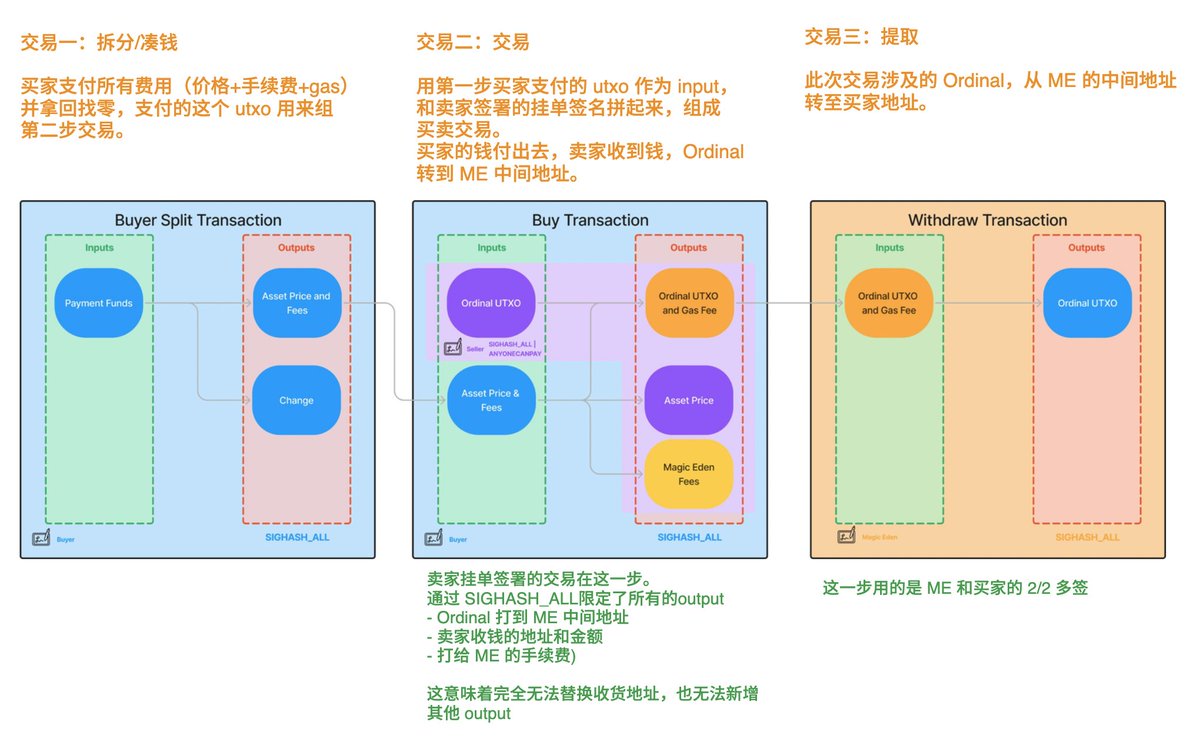 Magic Eden 的防狙擊交易機制將整個購買流程分為 3 筆交易: