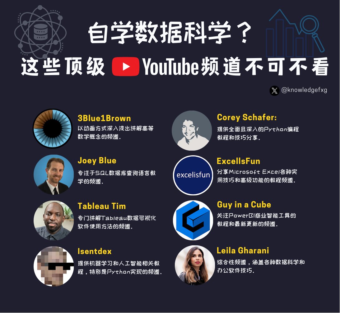 這些頻道涵蓋了從基礎數學、程式語言、資料處理、視覺化工具到機器學習的完整數據科學學習路徑。