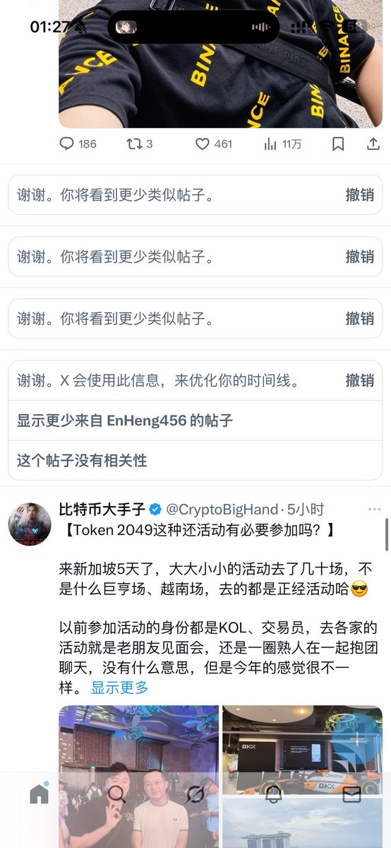 具體怎麼清理的話,比如之前大熱的項目 aster 都在發,我就會點「不感興趣」不再推送類似的東西。不玩合約推送合約類就清理,大數據很好用。