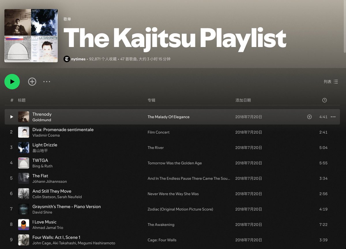 坂本龍一生前很喜歡去一家日本料理餐廳吃飯,餐館很棒,但是音樂很糟,於是他免費幫助這個餐廳定制了一個合適的歌單,叫做 The Kajitsu Playlist,完全沒有用他自己的音樂,挺適合安靜場合聽聽。