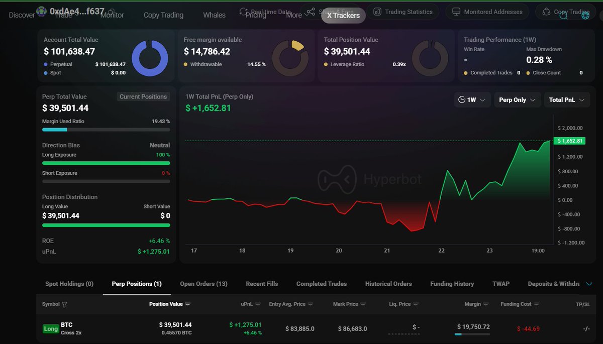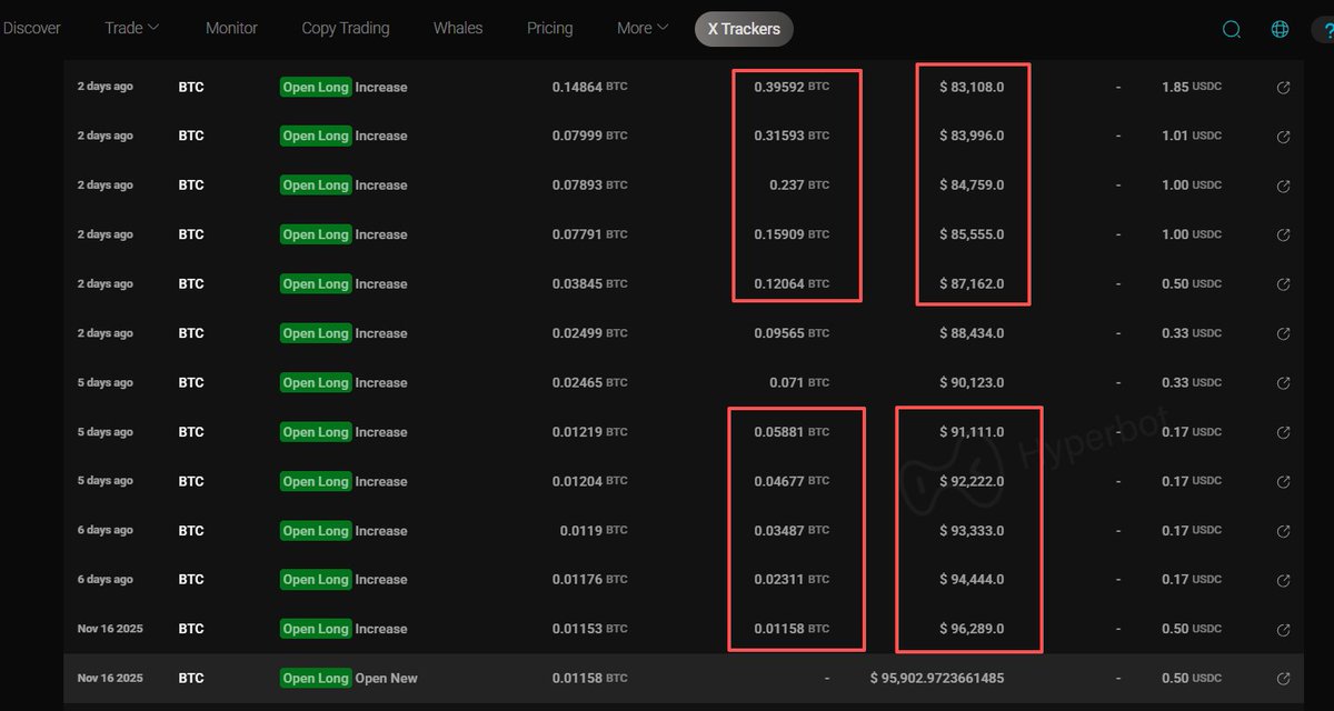 我仔細看了整個交易記錄,發現他其實是從 96,000 附近就開始買了。但短短不到一週,他把整體持倉均價壓到 83,885。
