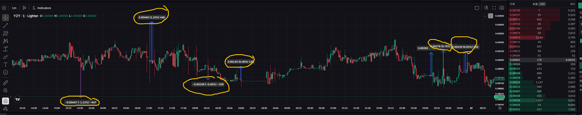 在 @Lighter_xyz 上可以觀察到 YZY 等交易對經常出現極限插針的狀況,這種現象特別適合進行 Liquidity Spike Reversion 策略。這種策略專門偵測長下影線或上影線(插針),在影線底部/頂部掛反向限價單(limit order),捕捉針尖回彈。由於 Lighter 屬於較小深度的市場,這樣的價格異常特別明顯。