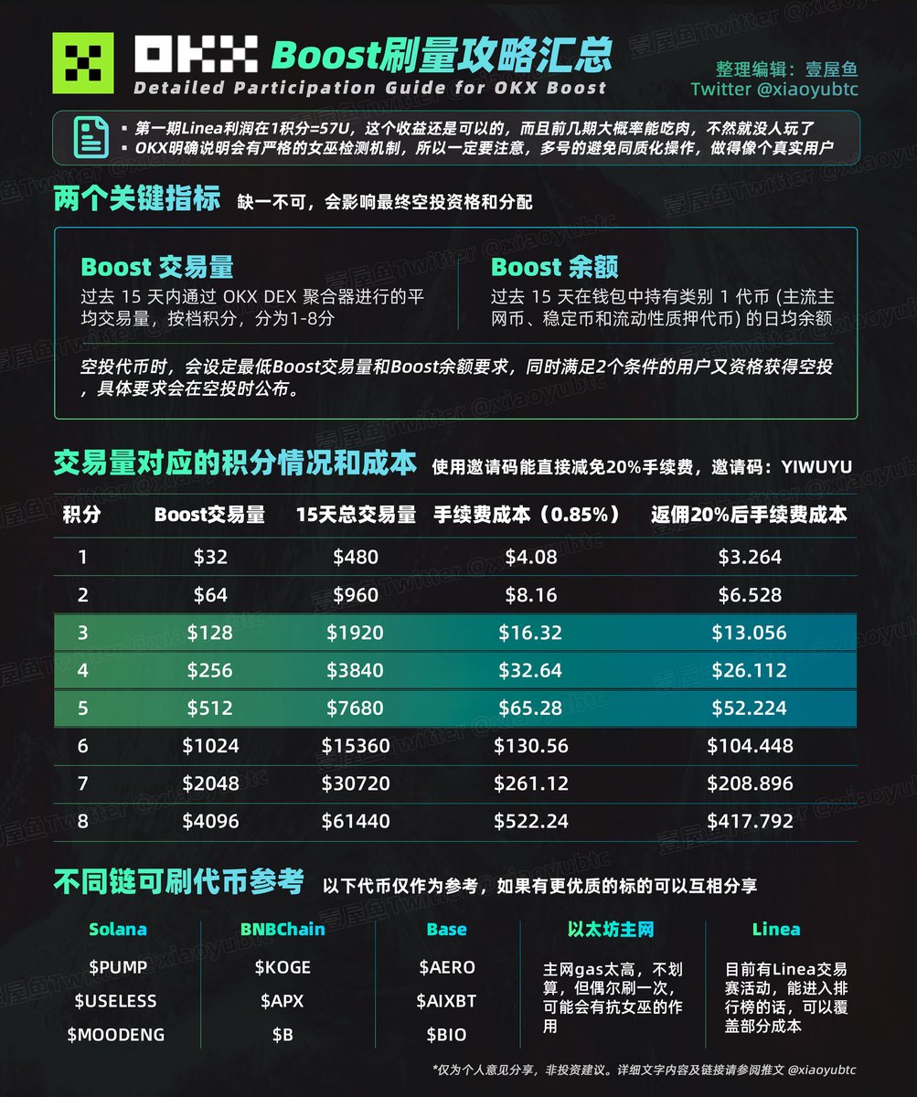 OKX Boost 刷量攻略彙總。第一期 Linea 利潤是 1 積分 = 57U,收益可觀,前幾期大概率能吃肉。Boost 統計的是 15 天平均交易量,只要前幾天多刷一點,也能追上早刷的人。