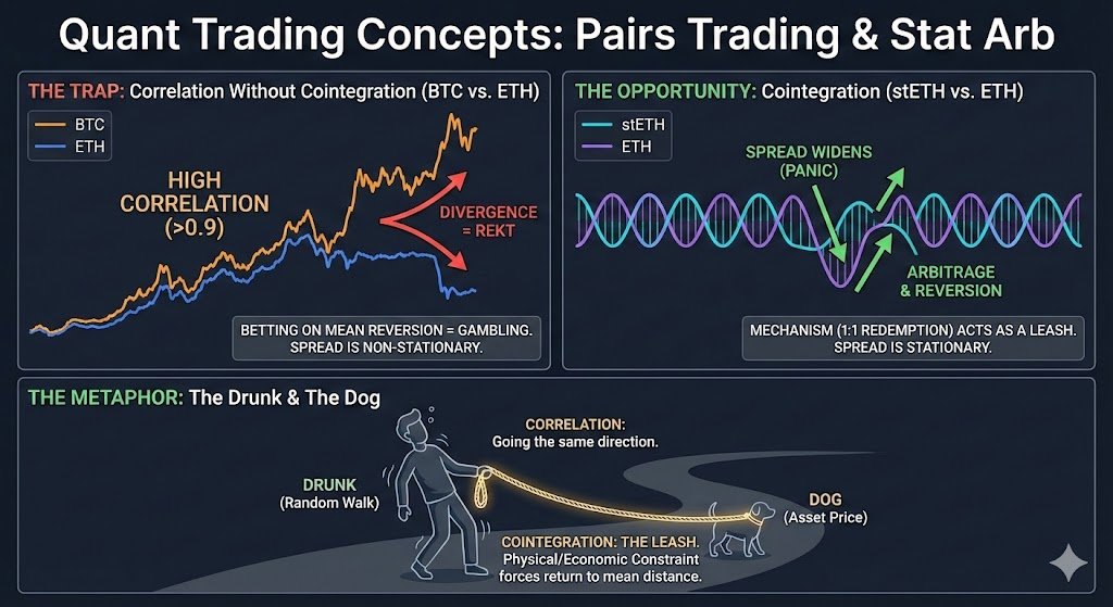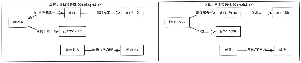 核心問題:相關係數高不代表價差會回歸,更關鍵的是「協整性」——價格線性組合的序列必須是平穩的。