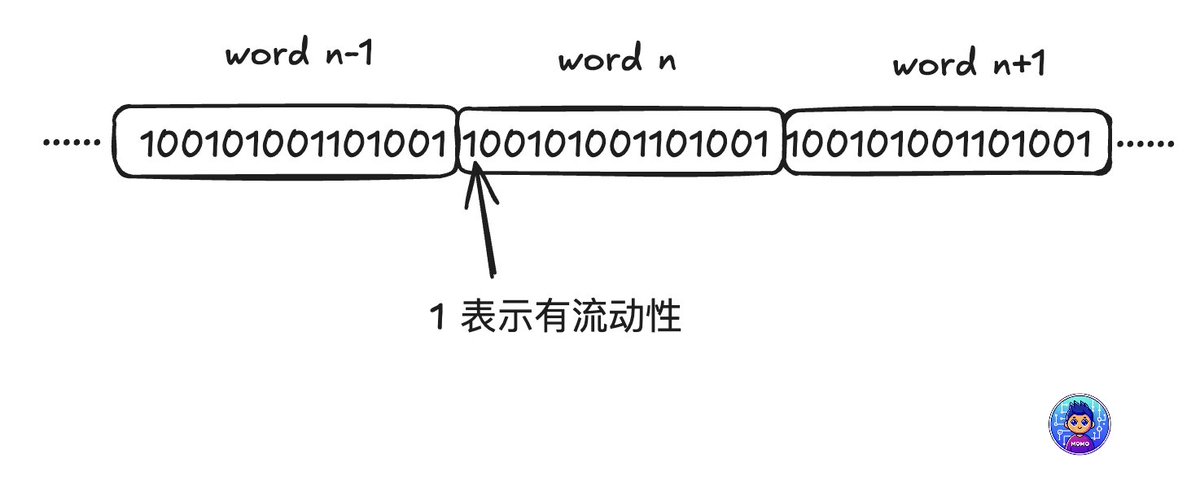 在 V3 中使用 Bitmap 來存儲 tick 的狀態,例如:100101001101001,其中:
