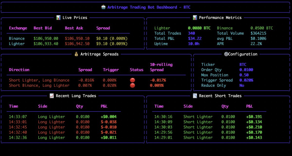 最近在 Lighter 上進行跨交易所套利實驗,代碼已穩定運行近一週,策略持續調整中,主要目標是找到下單量和每單盈利率的平衡點。
