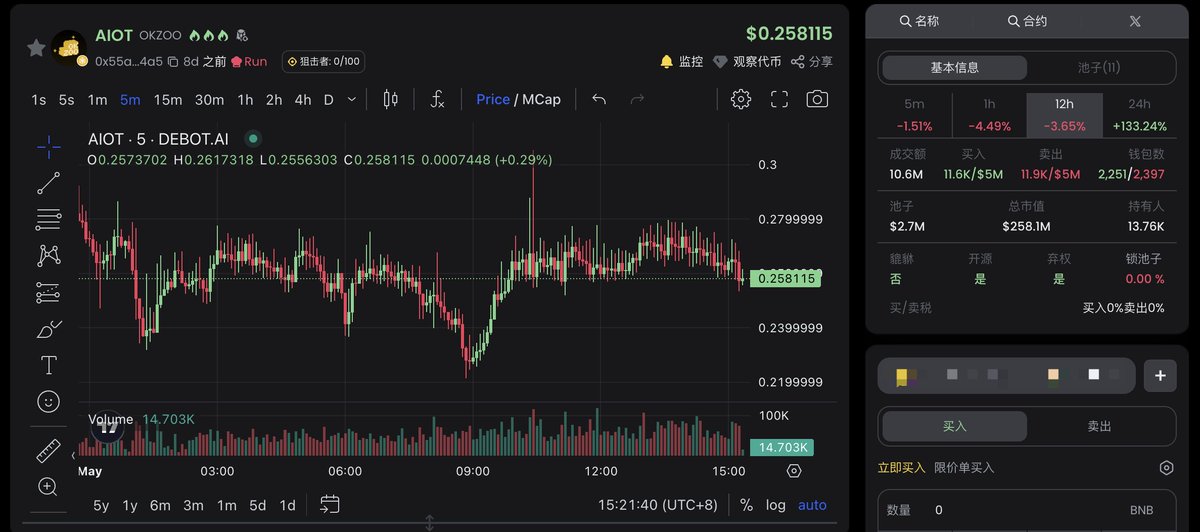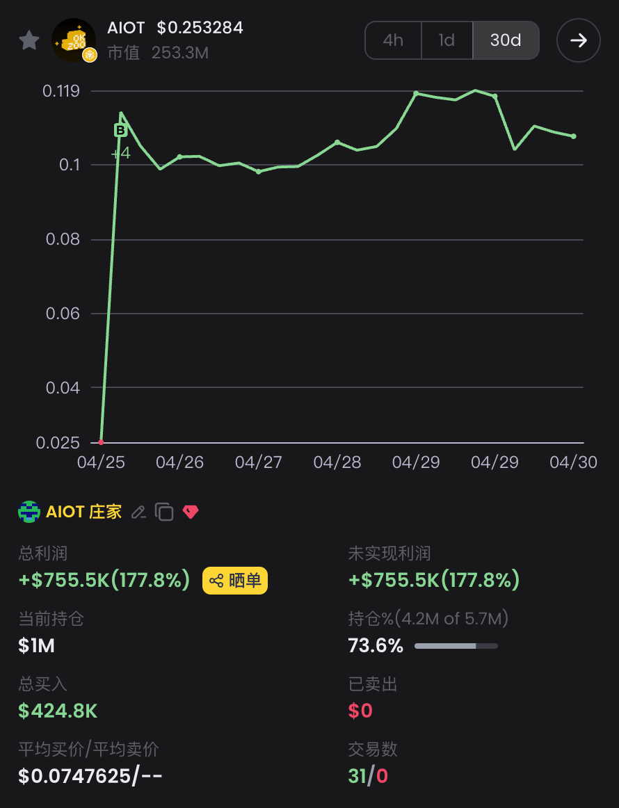 疑似 $AIOT 莊家地址已持有流通總量 23.7% 的籌碼。
