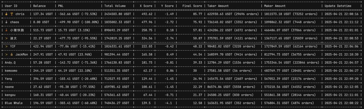 這個階段我自己總結就是,新手的盲目選擇吧,對前面的成績小有自信,到後面橫衝直撞並無策略可講(比如資金的分配、幣種的配比、利潤的保存、回撤的控制等等),只是會用工具而已,也在反思,這如果不是比賽,是十、百倍真金白銀我該怎麼辦,能力充足的前提,要敬畏市場,幾次波動就如此慘烈,何況使用的帳號還有手續費的優勢。