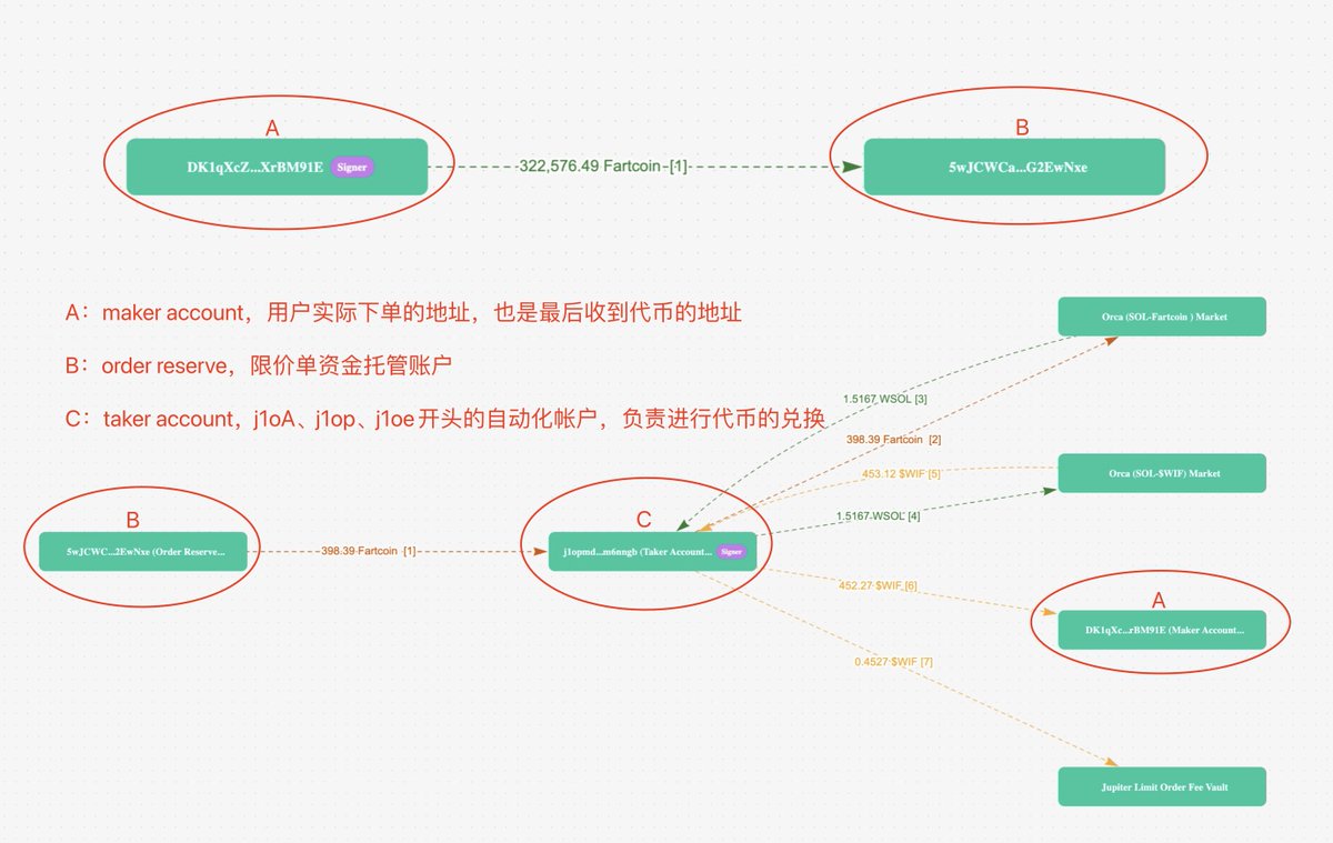 - C:三個自動化帳戶,負責進行代幣的兌換,在限價單中是 j1oA、j1op、j1oe 開頭的 Taker account,在 DCA 中是 JD1d、JD25、JD38 開頭的 DCA keeper