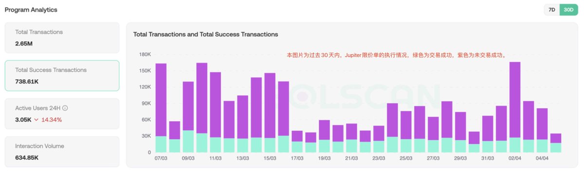 限價單訂單的掛單情況及價格,但掛單存在無法成交的可能。事實上,被成功執行的限價單是少數(可以去看最近一個月 solscan 上顯示的限價單成交情況)。