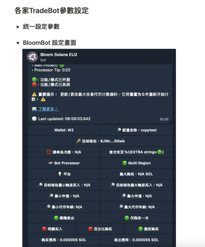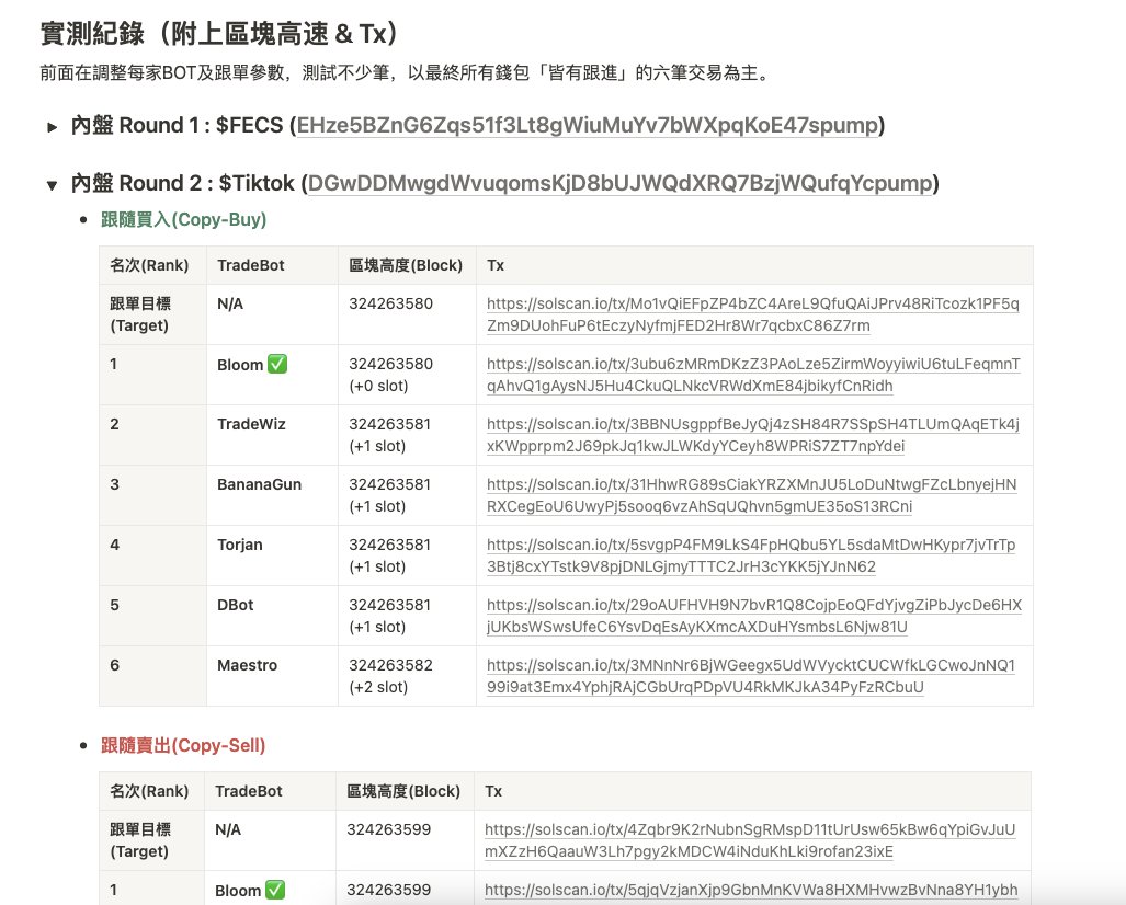 若照他說「交易速度在 1-2 個 slot 以內(800ms),完全就是市場上最快的跟單機器人」,建議回去重練。