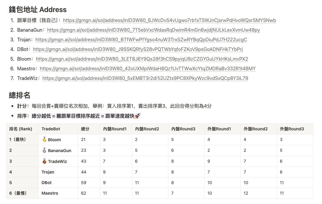 本次測試燒 1200U 手續費,進行全網最完整的跟單 BOT 速度實測。所有詳細紀錄包含每筆 tx 與各家 Bot 設定截圖都在 Notion Page 中。