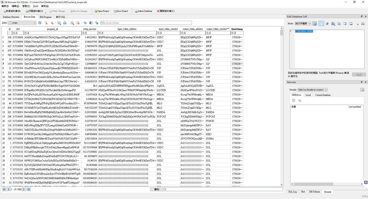 save_swap(swap_data)sol_change > 50 SOL代表這筆交易的 SOL 變化超過 50,才會被記錄- 解析出輸入代幣和輸出代幣,儲存到資料庫